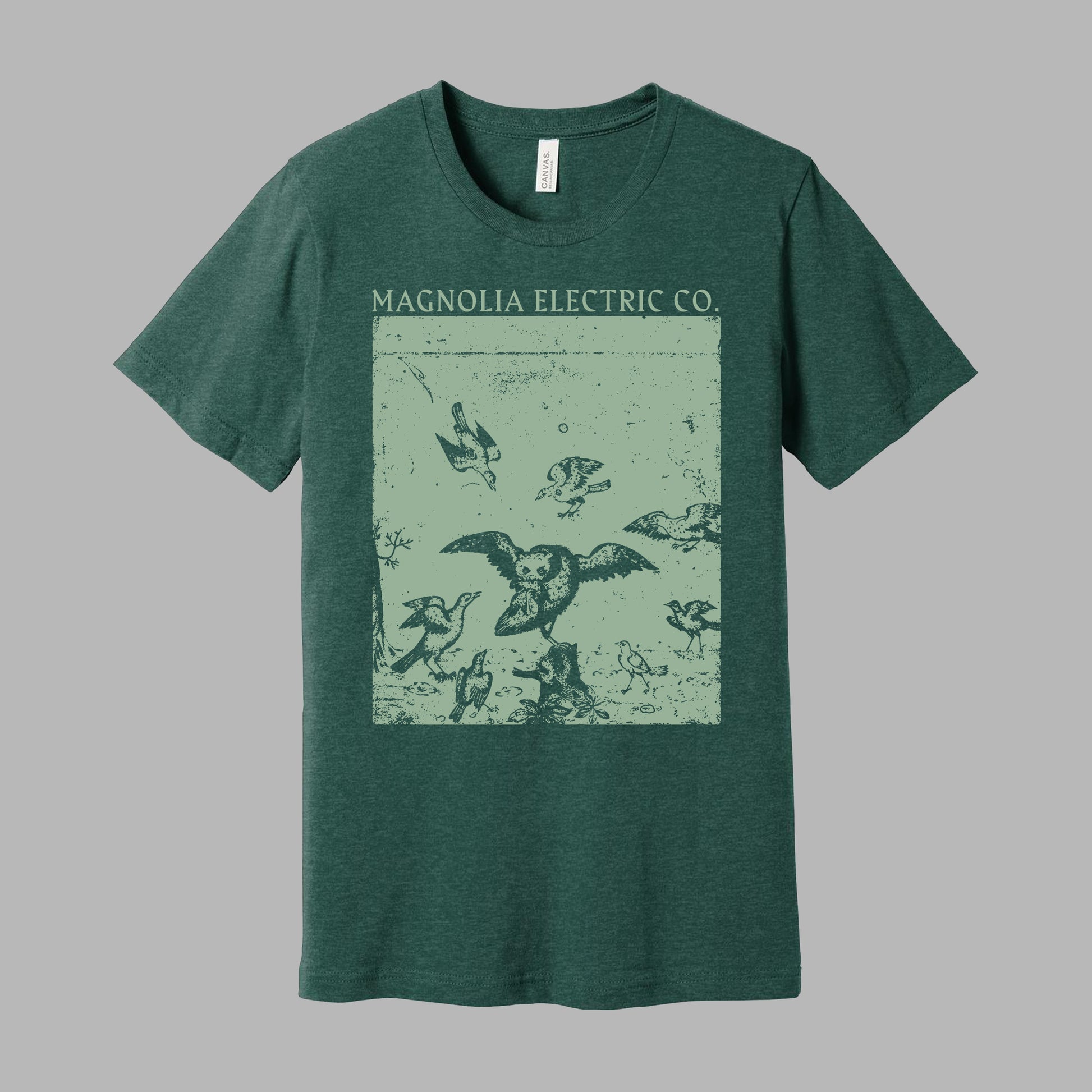 Bella + Canvas green t-shirts with mint screenprint of an exclusive Magnolia Electric Co. design.